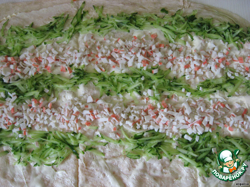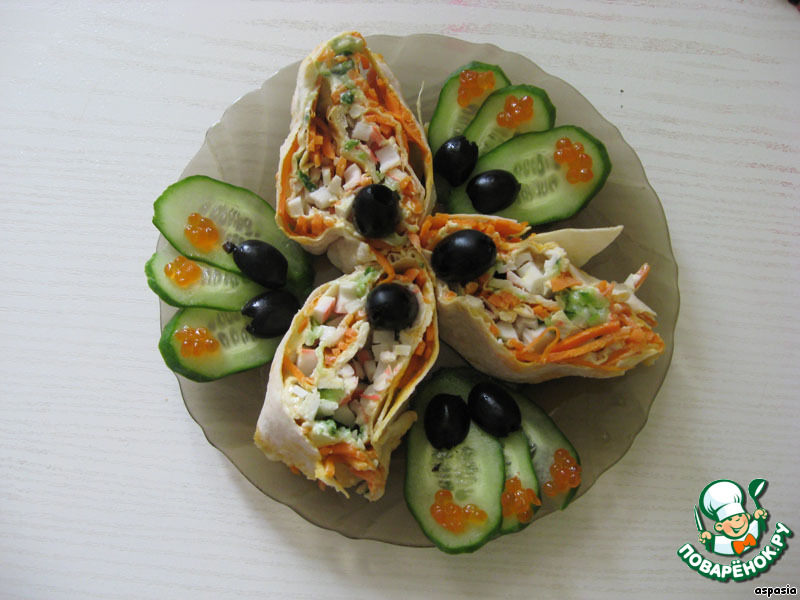 Традицию не нарушаем. Сочетание острой моркови по-корейски, нежного свежего огурца, крабового мяса делает рулетик желанным гостем на любом столе - и в праздник, и в будни!! На все случаи жизни -быстро приготовить, легко сервировать, аппетитно выглядит!!