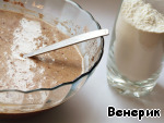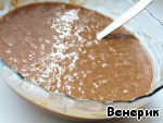 Просеять муку и разрыхлитель, смешать с жидкой массой до однородности.