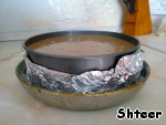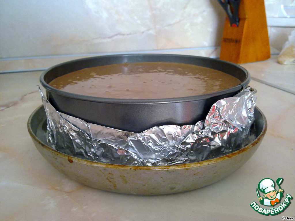 Теперь надо форму укутать фольгой и поставить в большую емкость. Вторую емкость заполняем теплой водой и ставим все в разогретый до 150-160 градусов духовой шкаф. Чизкейк выпекается 40-50 минут - в это время дверцу духовки не открываем, чтобы пирог не упал. -