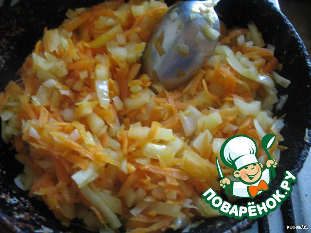 Морковь и лук обжариваем на растительном масле и кладем в бульон