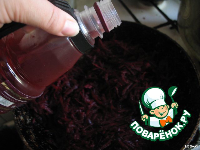 Обжариваем на сковороде свеклу с добавлением уксуса. Когда уксус выпарится, свеклу кладем в бульон.