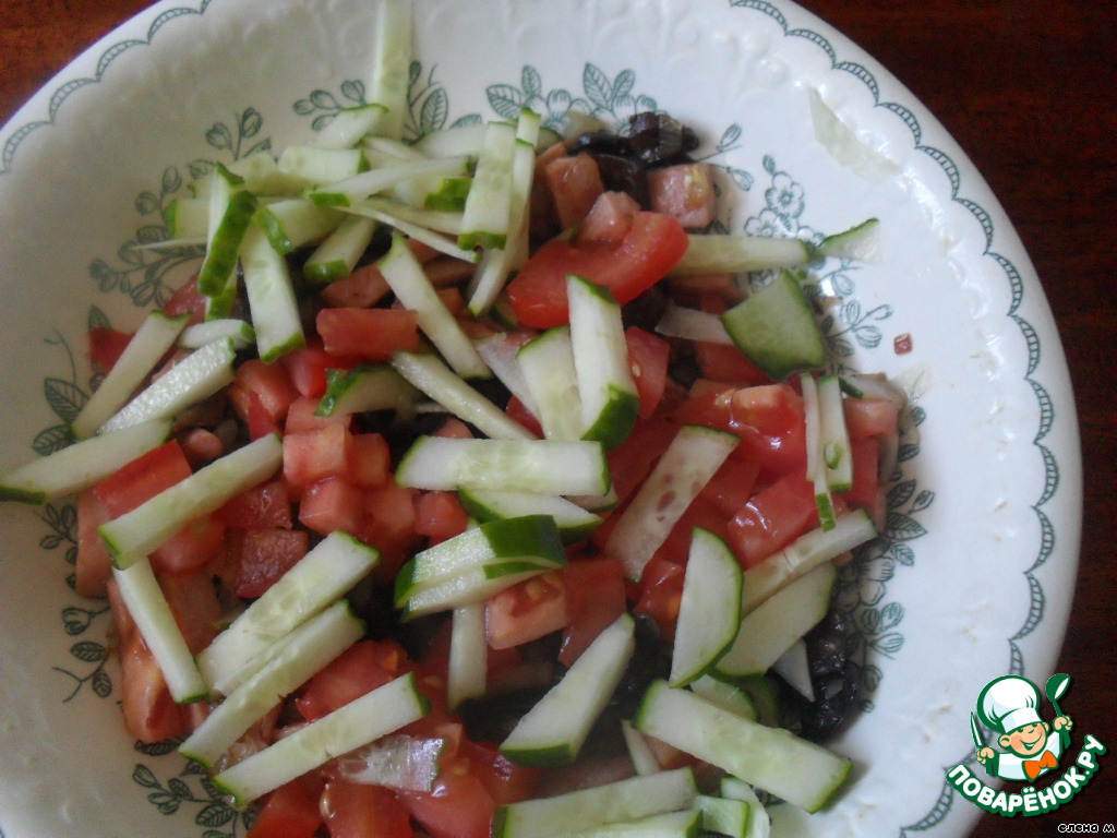 в остывшие грибы с луком и ветчиной добавить нарезанные кубиками помидоры и огурец (нарезать соломкой или брусочками)