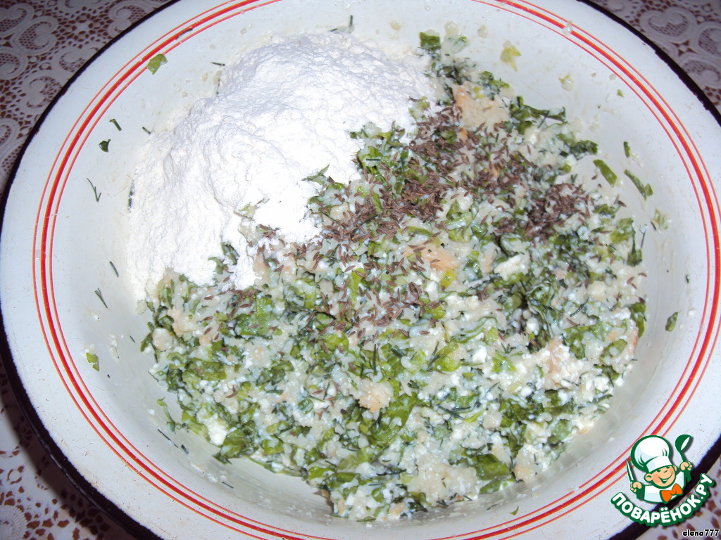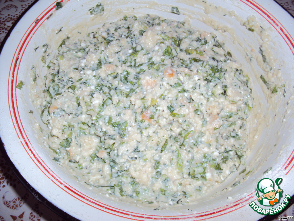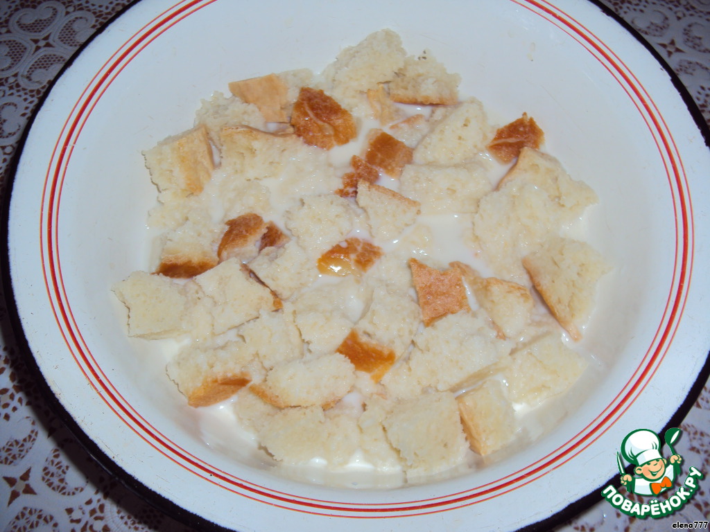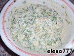 Когда кусочки хлеба впитают полностью молоко, добавить творог, яйца, тёртый чеснок, посолить, поперчить.
