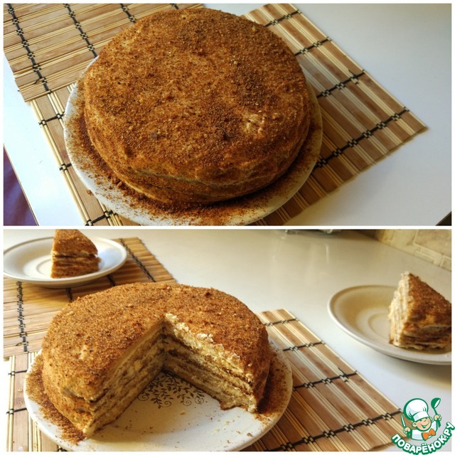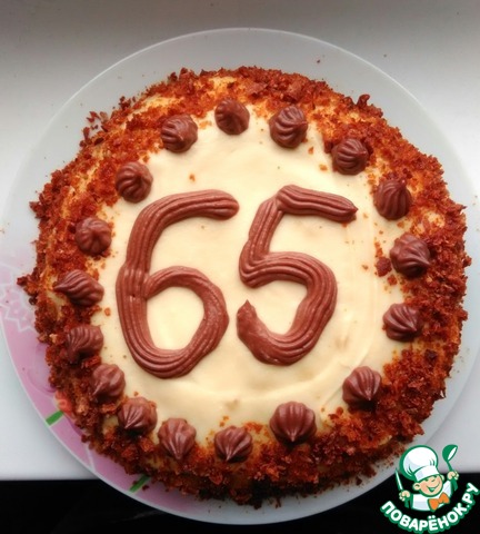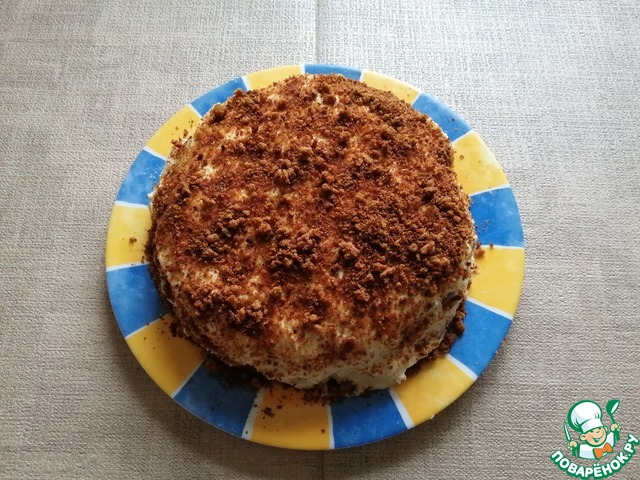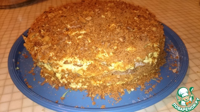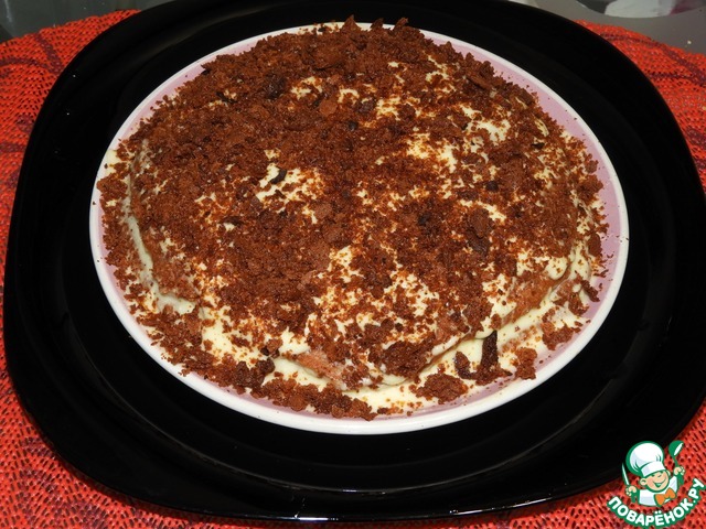 Обрезки коржей, подсушенные в духовке, измельчить и обсыпать торт. -
