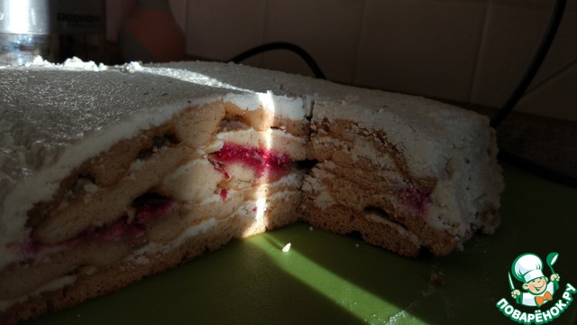 Торт получился из трех слоев, разорванный слой я поместила посередине. Крема как раз хватило и не осталось лишнего.