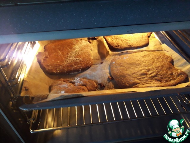 До момента извлечения из духовки особых проблем не было. А вот оторвать их от коврика - задача не из лёгких. В итоге первые два коржа я ещё как-то извлекла, а следующие два (у меня получилось всего 4) разорвались. В итоге из этих двух я по кусочкам извлекла один, а второй так и остался на двух тарелка. Что-то потом отскребла на крошки для посыпки)