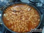 6. Вернуть в сковороду овощи и бекон. Добавить консервированную фасоль в томатном соусе, перемешать. Готовить под крышкой 10 мин.
