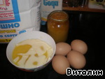 Смешиваем все продукты по очереди - яйца с сахаром, мед и растопленное масло, мука и сода.