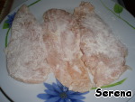 Пока масло топится, обвалять в муке каждый кусок грудки.