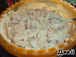 Сверху смазываем майонезом и отправляем в разогретую до 180-200 град. духовку на 1.5 часа.