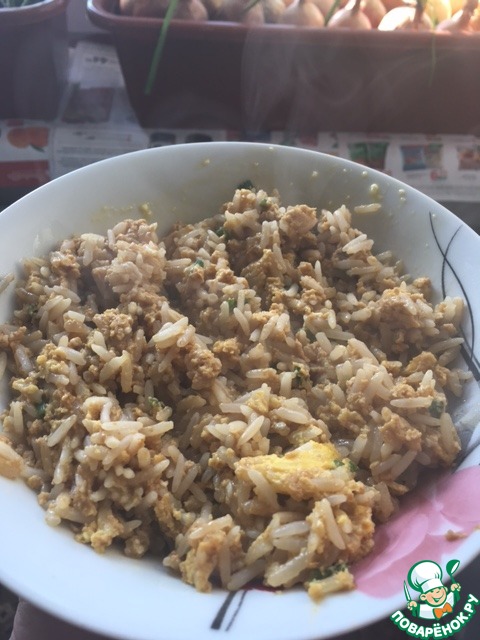 За это время рис подходит, и мы высыпаем его на сковородку к нашей яичнице.