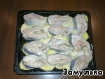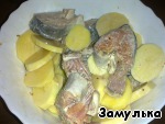 Противень смазать сливочным маслом, выложить картофель, рыбу и в духовку на 40 минут. |
