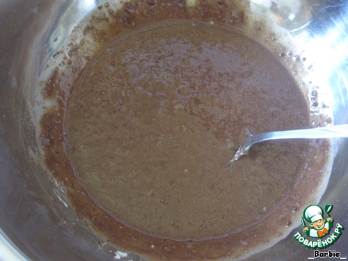 Затем добавьте муку и соду, смешайте всё в однородную массу, тесто должно получиться жидким.