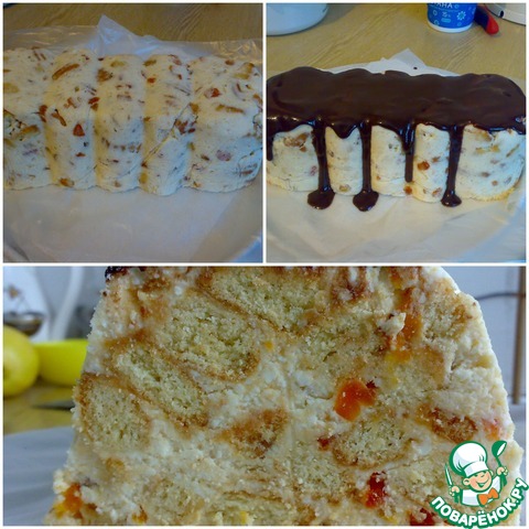 Вот и все. Теперь формочку выстилаем пищевой пленкой, выкладываем массу, накрываем пленкой и устанавливаем пресс. Всю конструкцию помещаем на ночь в холодильник для застывания. Когда тортик хорошо постоит и печенье пропитается - получается очень вкусный результат!