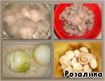- Шампиньоны (консервированные, можно взять свежие, цельные 250 г) — 1 бан.