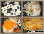 Разогреем сковороду, нальем масло, обжарим лучок до прозрачного цвета. Добавляем грибочки, обжариваем 3-4 минуты. Пока грибочки тушатся, морковь почистить, натереть на мелкой терке. Добавляем морковь в сковородку и тушим до 3-4 минуты.