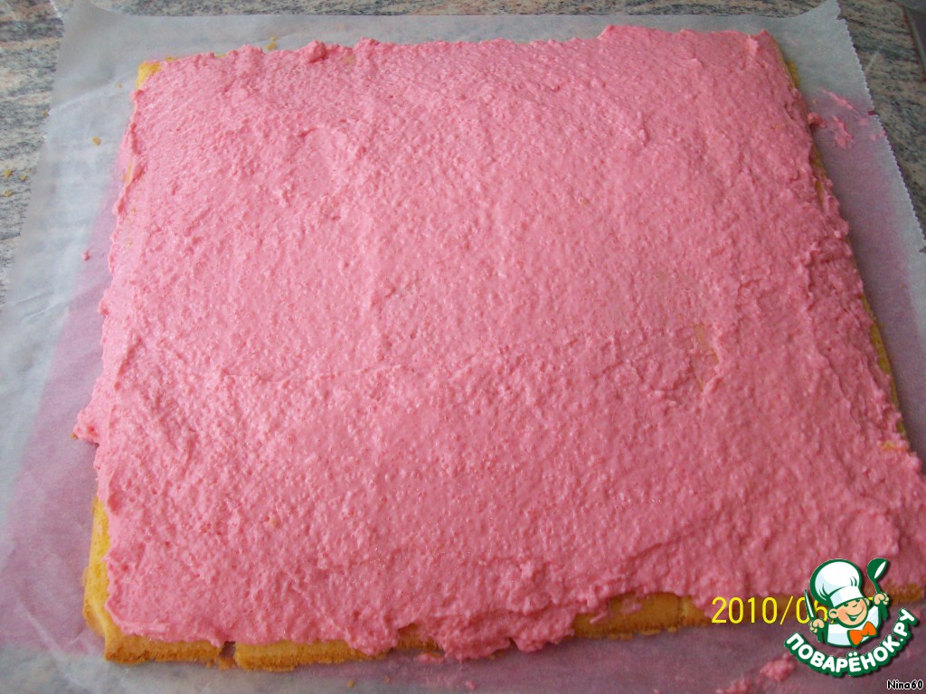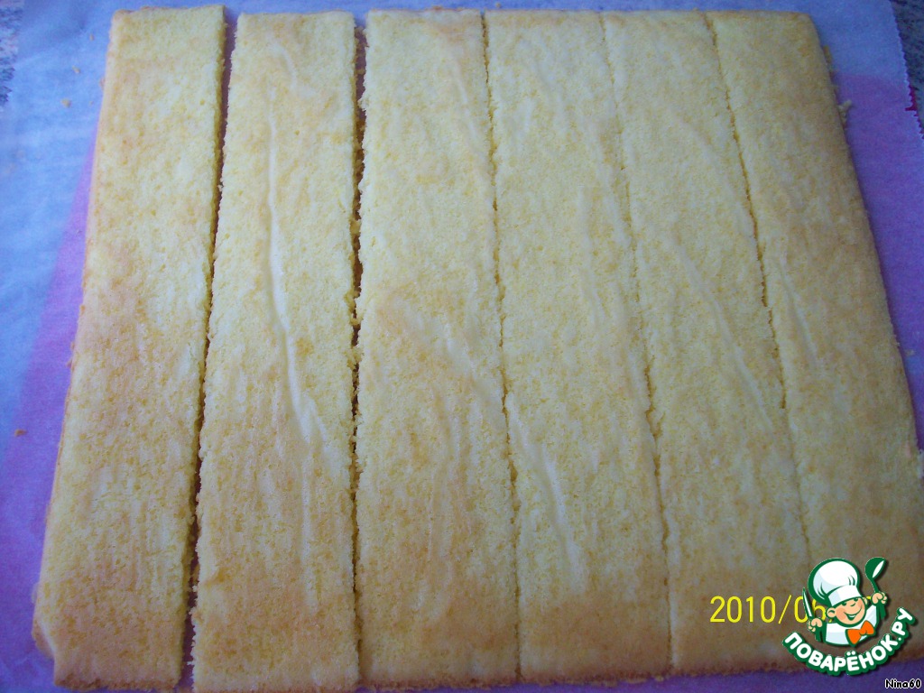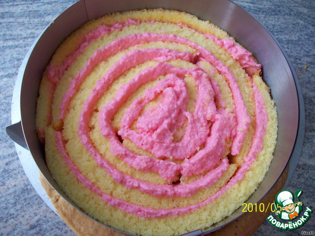 • Первую полоску свернуть рулетом, положить на середину круглого коржа. Остальные полоски выложить по спирали.