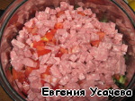 Увидела салат в магазине среди готовых салатов - как сейчас модно продавать. Пришла домой и сделала, но кое-что изменила (а именно - сыр порезала кубиками, а не терла на терке). Вкусное сочетание продуктов, может, кому и понравится...