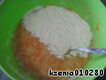 Постоянно помешивая, всыпать муку с разрыхлителем до консистенции густой сметаны. Я все делаю на глаз, поэтому, сколько именно муки уходит, точно сказать не могу, а в этот раз опять забыла измерить. :-[