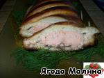 Батон и его «крышку» смазываем хорошо изнутри сметанно-майонезной смесью, выкладываем в него нашу рыбку, закрываем её приготовленной верхушкой батона.