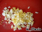 Отварить два яйца для начинки и нарезать их мелкими кубиками.