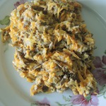 Печень и предварительно замоченную курагу нарезать соломкой, добавить тeртый на крупной тeрке сыр и остывшие овощи.