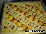 Укладываем рядами половинки абрикосов и яблоки, накрываем полосками теста, смазываем яйцом, выпекаем 45 мин. при 200*С