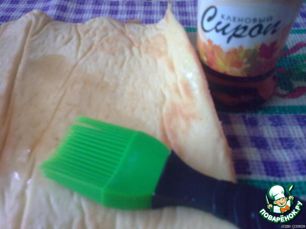 Бисквит развернуть и пропитать чем нибудь веселящим (ром или ликер). У меня рулет будет есть ребенок, поэтому пропитывала кленовым сиропом.