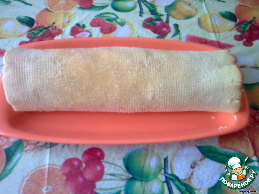Приготовить полотенце, присыпать его слегка сахаром. Выложить готовый бисквит на него. С помощью полотенца свернуть рулетом. Остудить.