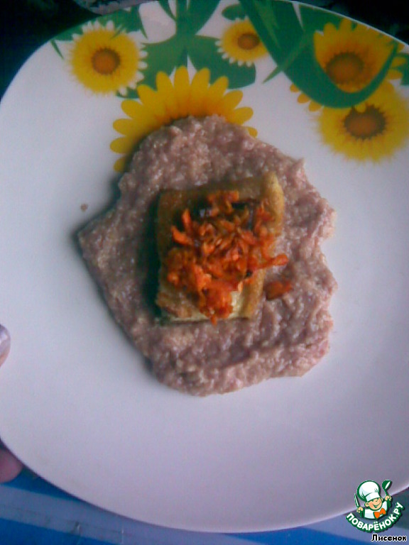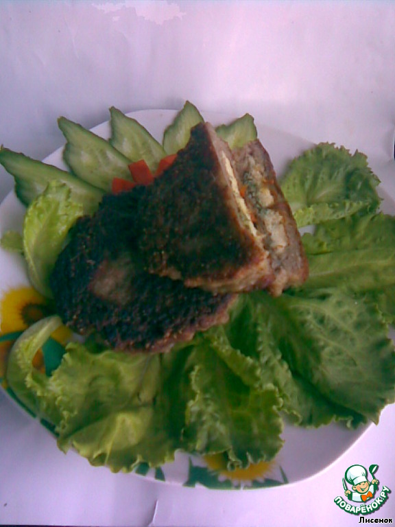 Из фарша сделать лепешку, положить на нее кусочек омлета, сверху выложить жареные лук и морковь.