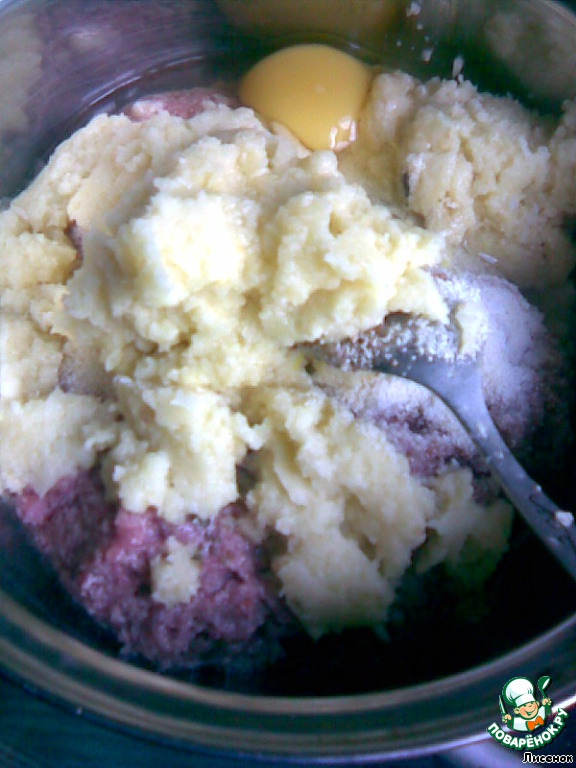 Соединить фарш, картофельно-луково-чесночную массу. Добавить яйцо и соль, перец по вкусу.