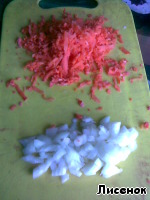 Для начала почистить лук и морковь. Лук измельчить, морковь натереть на терке.