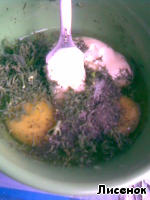 Три яйца смешать с майонезом. Добавить по вкусу соль и перец. Рубленый укроп.