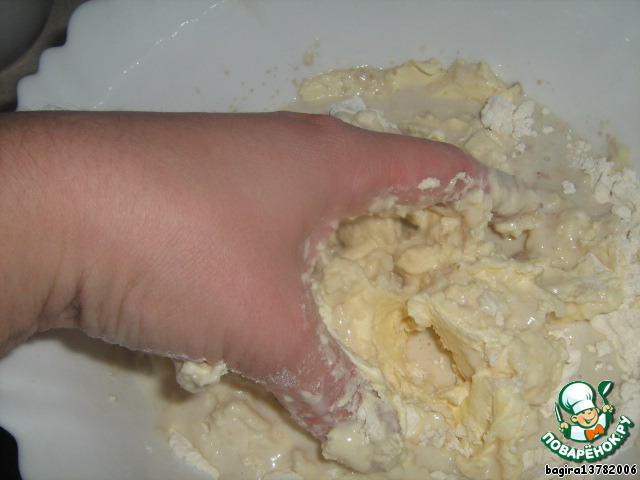 Постепенно вводим муку, и размешиваем тесто руками, чтобы маргарин равномерно смешался с мукой.