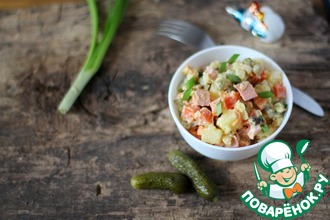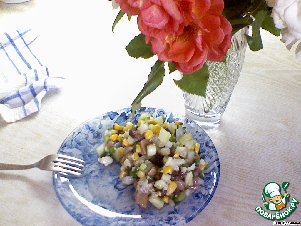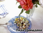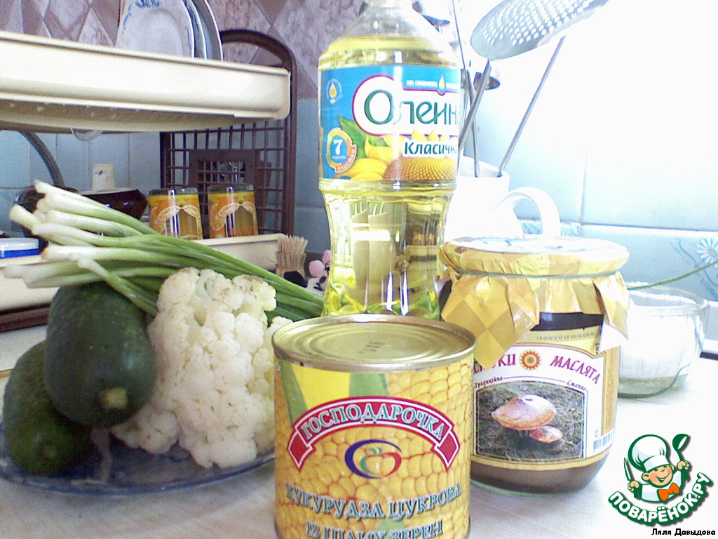 Сегодня я зарегистрировалась и рада поприветствовать всех! Рискуя показаться тривиальной, я все-таки представляю свой дебют винегретом. Выбор продуктов определяется исключительно моими вкусовыми пристрастиями, и, рассудив, что любимые по отдельности продукты, вкупе, просто обязаны доставить мне райское наслаждение, я воплотила свою задумку и подтвердила свое предположение. Мужу тоже понравилось. Больше подопытных не подвернулось. Кто рискнет? На мой взгляд, привлекательность этого винегрета в многовкусии: цветная капуста, являясь базовой основой блюда, оттеняет свежесть огурцов, сладость кукурузы, пикантность маринованных грибов, свежесть и остроту зеленого лука.