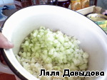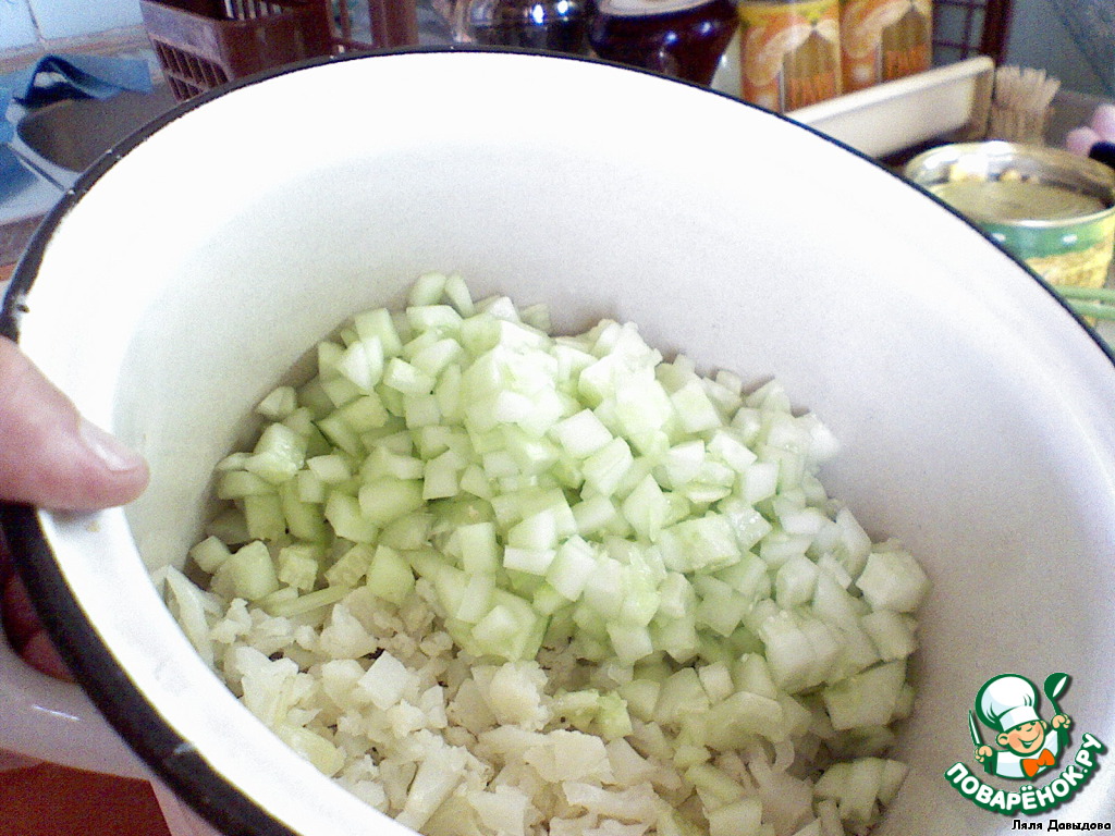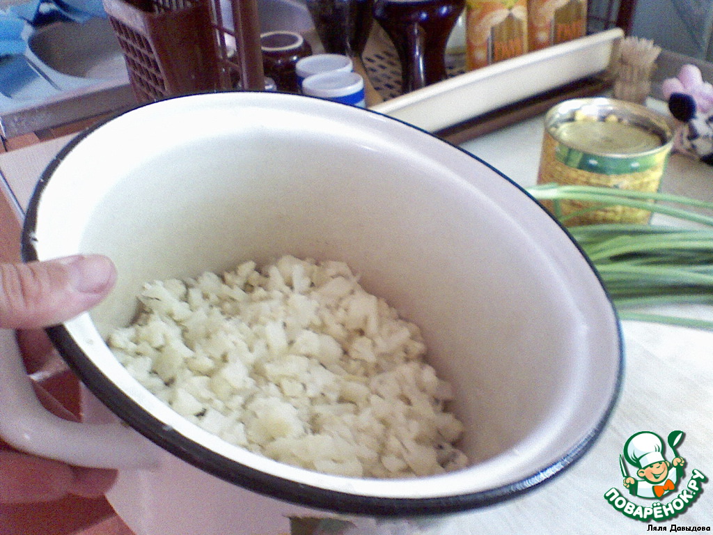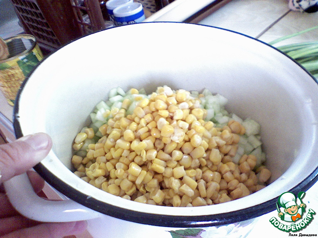 При нарезке руководствовалась основным принципом винегрета: измельчать продукты до размера самого мелкого неделимого компонента – в моем случае, до размера кукурузного зерна.