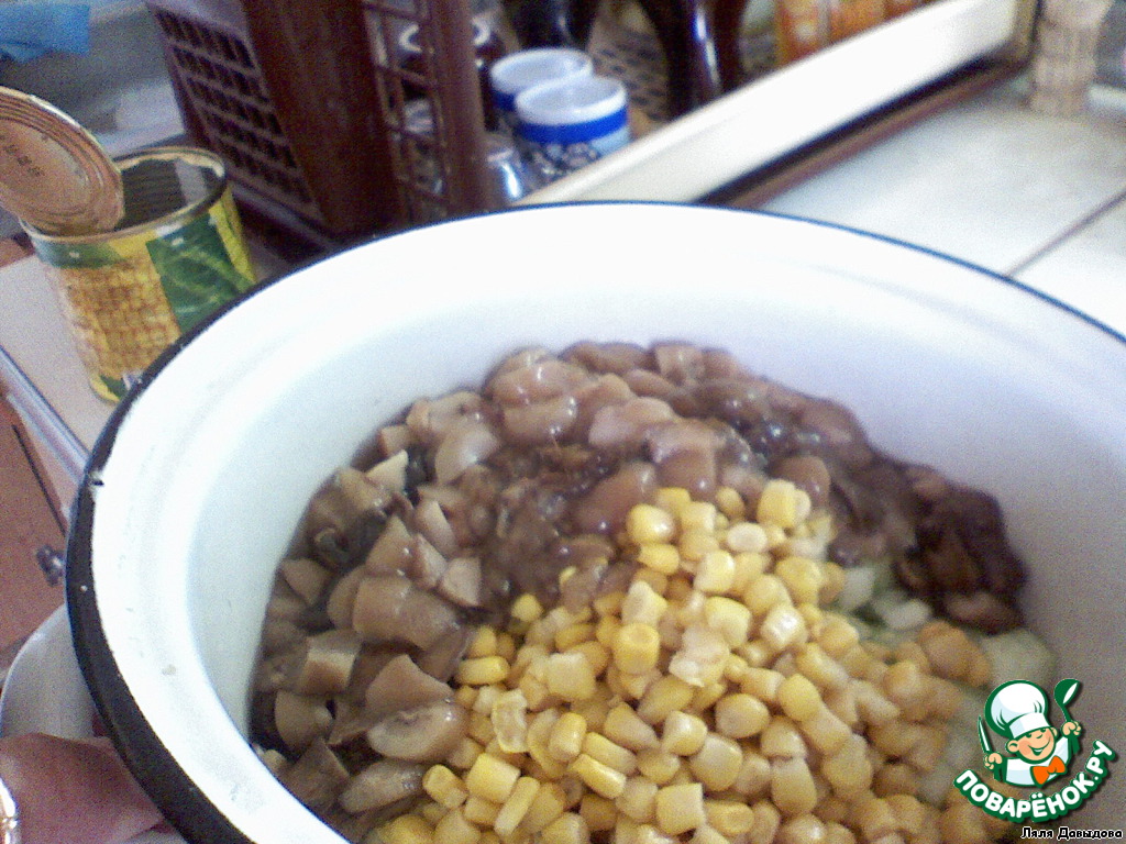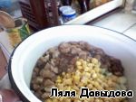 Далее выложим кукурузу, предварительно тщательно слив жидкость из банки.