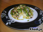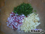 В это время мелко режем яблоки, редис и рукколу. Затем перемешиваем и щедро поливаем свежевыжатым соком лимона.