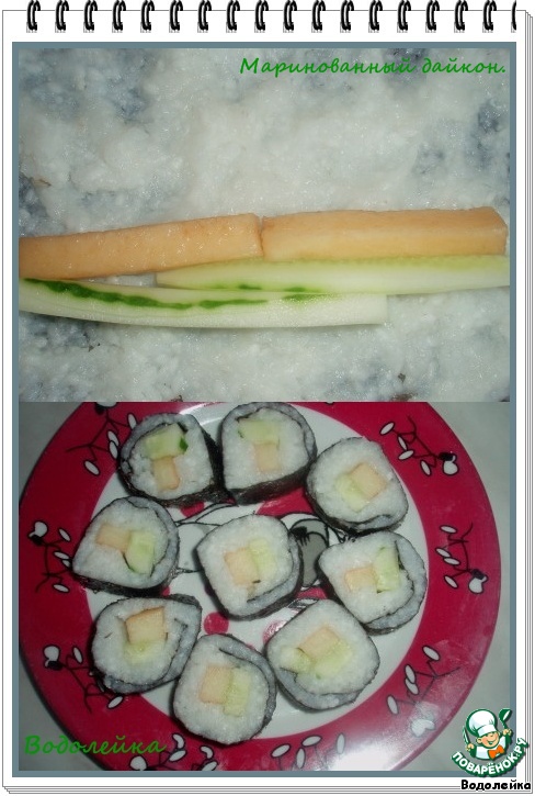 Вот я использовала уже готовый дайкон в суши. Это суши с огурцом и дайконом.