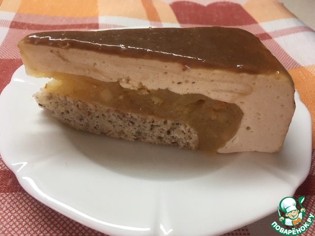 На карамель выкладываем остаток кофейно-карамельного мусса, накрываем бисквитом и убираем в морозильную камеру для быстрейшего застывания.