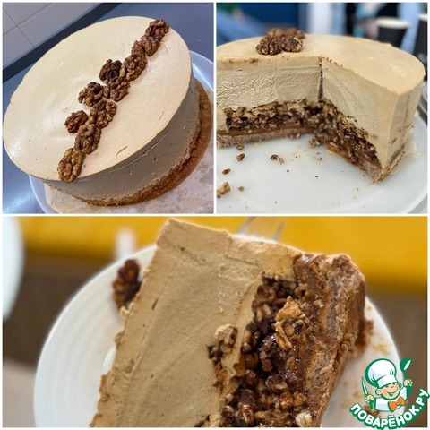 сверху выложим подготовленные орехи и уберем форму в морозильную камеру до полного застывания (примерно часа на 2-3).) Потом ( В форму диаметром 26 см выкладываем одну треть кофейно-карамельного мусса и убираем в морозильную камеру на 20 минут.Затем вынимаем форму с кофейно-карамельным муссом, в центр кладем замороженную ранее часть с орехами, а на нее выкладываем еще часть кофейно-карамельного мусса, заполняя при этом пространство между замороженной частью и формой.) Я что то упустила? куда делся крем? Там на фото просто видно что первый слой сверху белый потом чуть темнее, хотела понять это один крем или их 2?)
