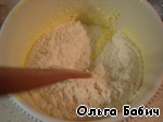 Муку смешать с разрыхлителем и ввести в приготовленную массу, перемешать шпателем.