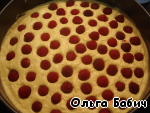 Выложить тесто в разъемную форму номером 26, сверху - малинку, немного прижать ее ложкой.