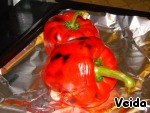 Перец запекаем в духовке до образования "черных точек" ( я на фольге запекаю). Минут на 10 оставляем в фольге.
