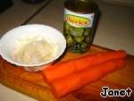 Оливки порезать кружочками. Морковь кубиком.