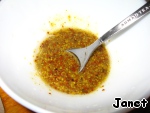 Приготовить заправку из зерновой горчицы, масла и лимонного сока. Перемешать и заправить салатик. Украсить зеленью.