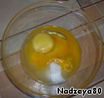 Сильно разогрейте духовку. В это время положите яйцо с желтком и сахаром в миску.