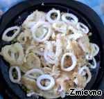 Кальмары почистить, нарезать кольцами. Из яйца, муки, соли и небольшого количества воды приготовить кляр. Кольца кальмаров окунать в кляр и обжаривать на растительном масле с двух сторон. Половину кальмаров в кляре выложить третьим слоем, посыпать сыром, смазать майонезом.