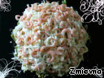 Следующий слой: половина отваренных и очищенных креветок, сыр майонез. Еще раз повторить все слои, украсить по желанию.