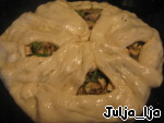 Руки и противень смазываем растительным маслом. Формируем из подошедшего теста лепёшку, довольно большую (просто используем всё тесто, по размерам противня). Выкладываем в центр лепёшки начинку, горкой.